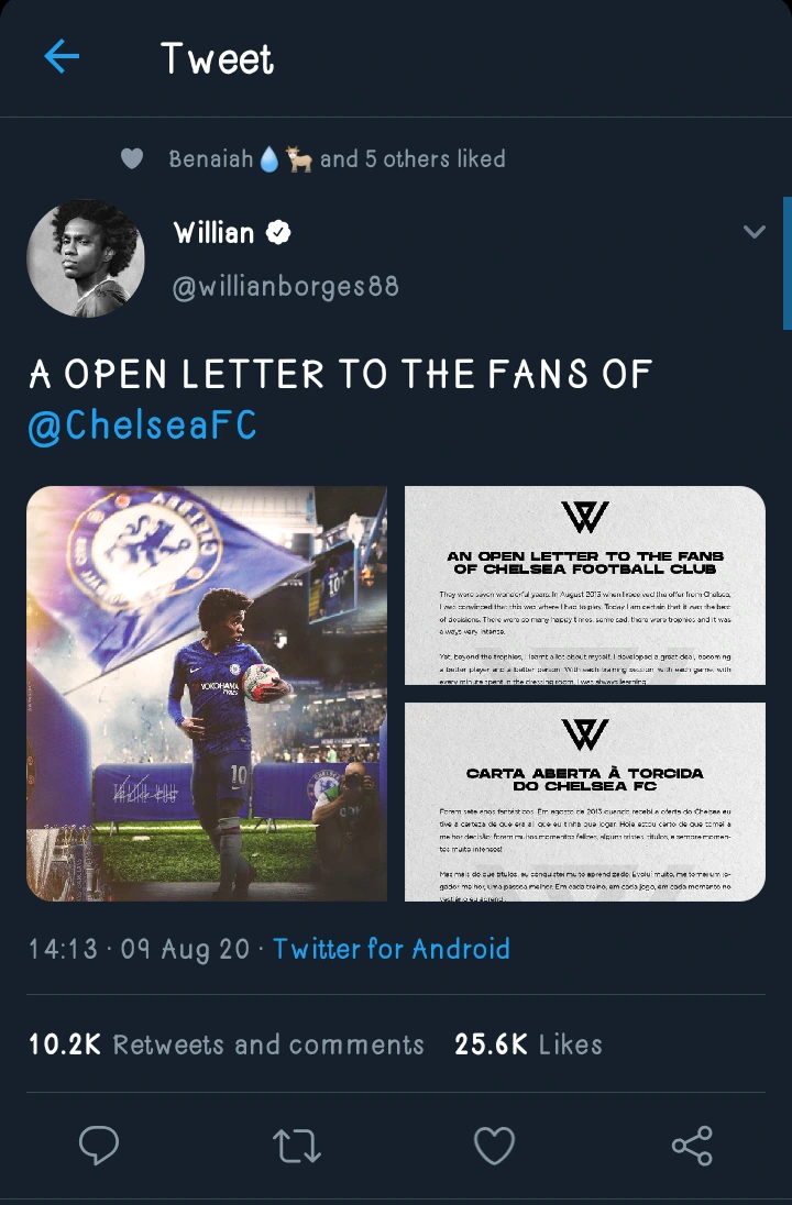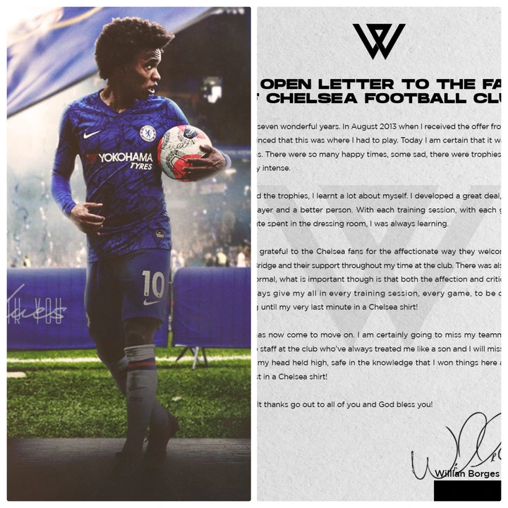 Chelsea winger Willian has officially shared his open letter to Chelsea fans as he finally says goodbye to the club he spent seven years playing for.