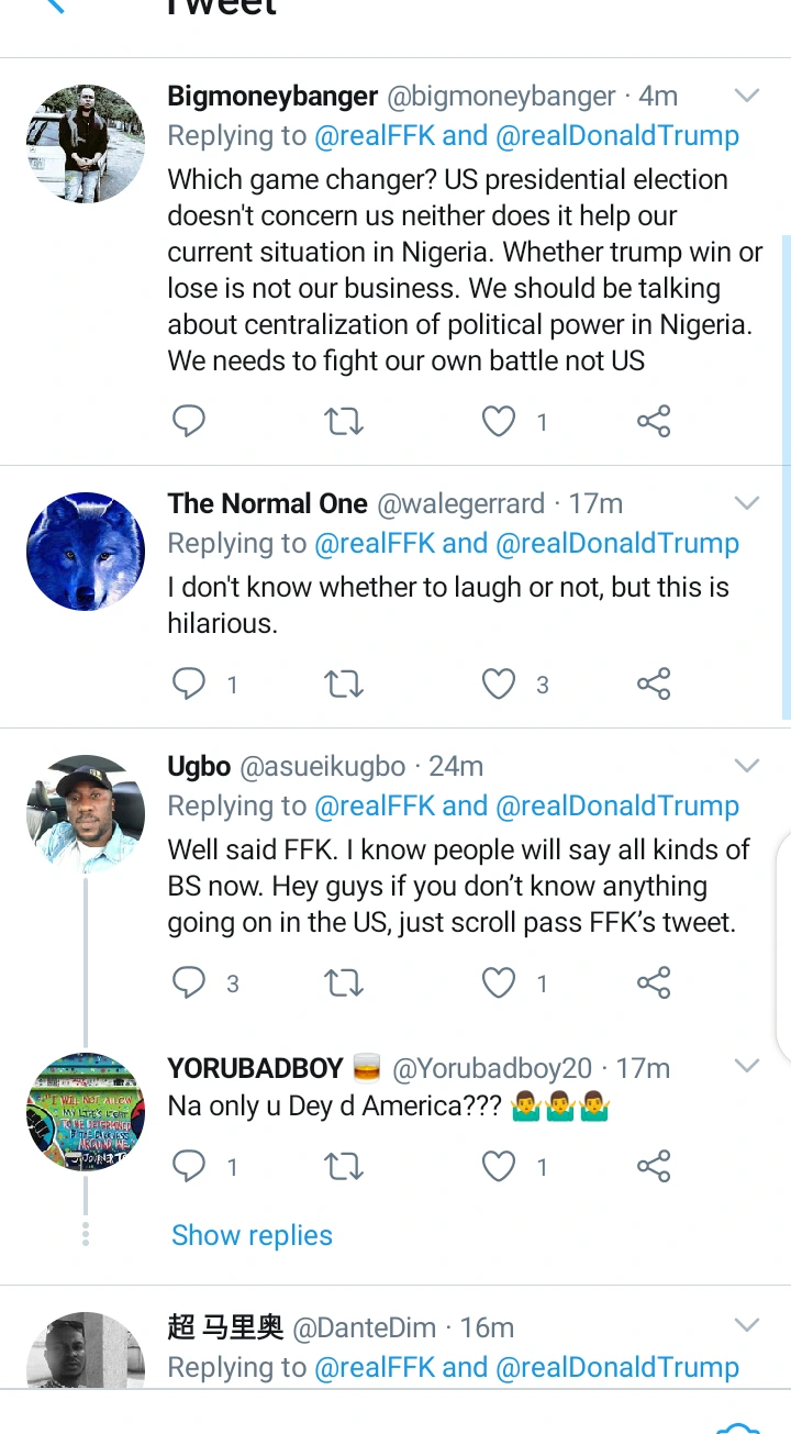 Like FFK, many other persons believed that Trump is God’s choice on who will lead the people of America, and that is why he has remained fervent with faith that Trump will emerge as the winner despite the way things are looking currently.