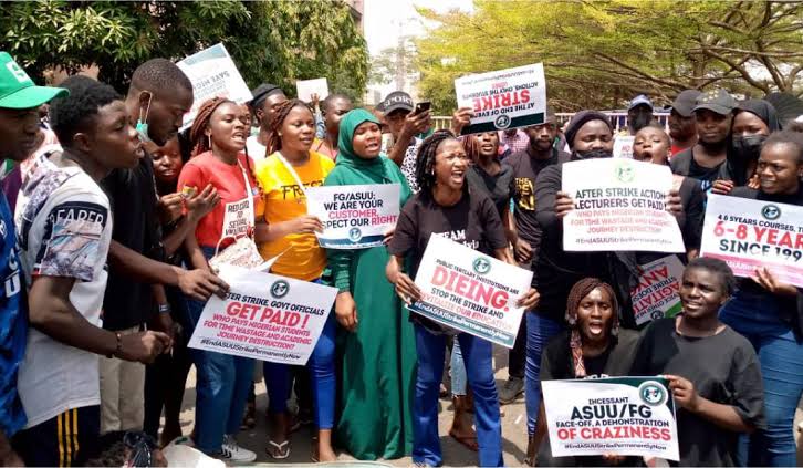 They carried placards with various inscriptions such as “End ASUU Strike Permanently Now,” “After Strike Government Officials Get Paid, Who Pays Nigerian Students for Time Wasted,” ‘Employment Comes with Age Limits,” “Age is Irreversible,” among others.