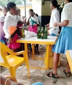Photos posted online have shown some Secondary School students celebrating the end of their WAEC examinations in a beer parlour in Uyo, the Akwa Ibom state capital.