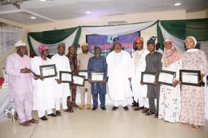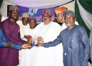 Left: The Chairman Nigeria Union of Journalist Kwara Council, Mr Abdullateef Ahmed presenting the award to the Deputy Governor; Mr Kayode Alabi representing the Kwara State Governor(3rd right) while the Commissioner for Communications; Mr Olabode Towoju(2nd right), Chairman Correspondent Chapel Kwara State NUJ; Mallam Abdulhakem Garba(1st right), S. A. Strategy; Alhaji Salaudeen Sa’ad(3rd left) and Alhaji Ghali Alaya(2nd left) joined at the Correspondent Chapel of Nigeria Union of Journalists, Kwara State Council’s Annual Press Week award night at Ilorin.