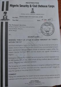 The NSCDC FCT commandant, Peter Maigari, who issued the Red Alert in a restricted memo dated Friday, July 8, 2022 and entitled; ‘Renewed Threat Of Attack By ISWAP Terrorist On Targets Within The FCT’, said: “Certified intelligence reveals that members of the decimated terrorist group, Islamic State in West Africa Province (ISWAP) have concluded plan to launch more coordinated and spontaneous attacks on selected targets within the FCT and have declared war against Christians in Nigeria.