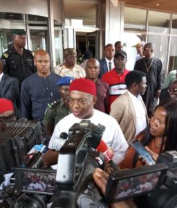 Governor Hope Uzodinma, fielding questions from Journalists at the NGE conference in Owerri.