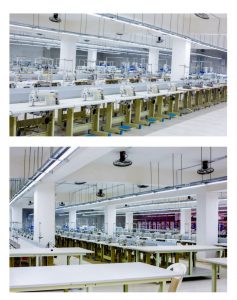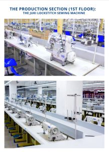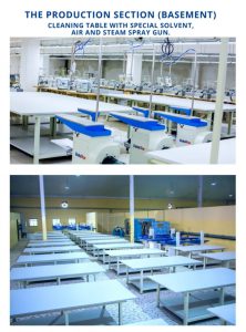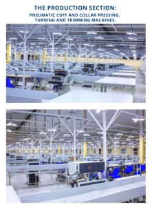 The factory is made up of the production section, embroidery section, cutting section and other sections which have been equipped with sophisticated machines, such as Lockstitch Sewing machines, Pneumatic Cuff and Collar Pressing, Turning and Trimming machines, Coverstitch and Overlock Sewing machines.