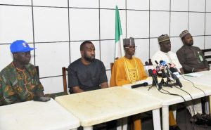 L-R: Chairman Kwara State Sports Commission Alhaji Bolakale Magaji; Managing Director Ilorin Innovation Hub Mr Temi Kolawole; Commissioner for Communications Hon. Saddiq Buhari; Commission for Agriculture and Rural Development Mallam Abdullateef Gidado Alakawa; and Special Assistant to the Governor on Student Affairs Hon. Mubarak Salau Bello; during a press conference by subcommittee members of the 2022 Kwara State Merit Awards, in Ilorin, on Wednesday.