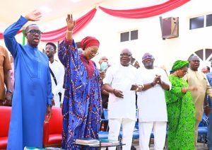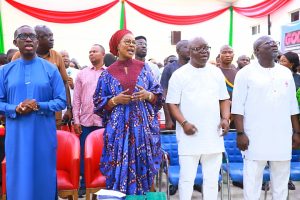 Pix 7893. From left: Delta Governor, Senator Dr. Ifeanyi Okowa, his wife, Dame Edith Okowa, former Governor of the State, Dr. Emmanuel Uduaghan, Governor -Elect of the Peoples Democratic Party (PDP) in the state, Rt. Hon. Sheriff Oborevwori, his wife, Tobore and his Deputy, Sir. Monday Onyeme, praising God at a special thanksgiving service to celebrate the Victory of Rt. Hon Sheriff Oborevwori at the Government House Chapel, Asaba on Monday. PIX: SAMUEL JIBUNOR
