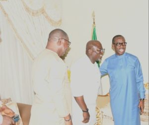 Pix 180518:: Delta Governor, Senator Dr Ifeanyi Okowa (right), congratulating the Governor-elect, Rt. Hon. Sheriff Oborevwori (2nd right), and his deputy, Sir Monday Onyeme shortly in Government House shortly after the announcement of Oborevwori as Winner by INEC on Monday .PIX :Enarusai Enarusai