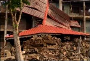 The collapsed structure sits in front of a residential three-storey building in the area.