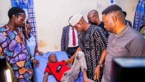 Ekiti State Governor Biodun Oyebanji with a released teacher and pupil of The Apostolic Nursery and Primary School, Emure at the Ekiti State University Teaching Hospital (EKSU) in Ado-Ekiti…yesterday