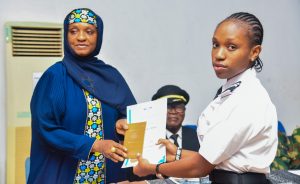L-R: Kwara State Commissioner for Tertiary Education, Hajia Sa’adatu Madibbo Kawu presenting license to one of the newly trained pilots, Smart Ebube; during the graduation ceremony of International Aviation College, Ilorin.