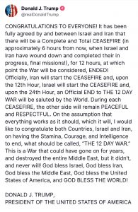 BREAKING: Iran and Israel has agreed to a “complete and total ceasefire”, Trump says.