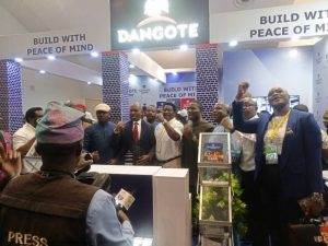 Staff of Dangote Cement Plc, and its distributors cheering the company at the ongoing Africa International Housing Show in Abuja…Thursday