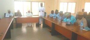 Chairman of the Committee, Alhaji AbdulRahman Tunde Sidiq, delivering his acceptance speech, while the Commissioner for Tertiary Education, Hajia Sa’adatu Modibbo Kawu (1st Right), Ag. Director, PFF, Mrs. Rasheedat Salman (2nd Right), Mr. Afolayan Husain (3rd Right), and other members of the Committee look on during the inauguration of the Committee to develop a blueprint for the co-existence of COED and KWASUED, Ilorin, Wednesday.