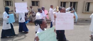The News Agency of Nigeria (NAN) reports that the healthcare workers carried inscription during the protest such as “Hands that heal, should not bleed, say no to assault on doctor”.